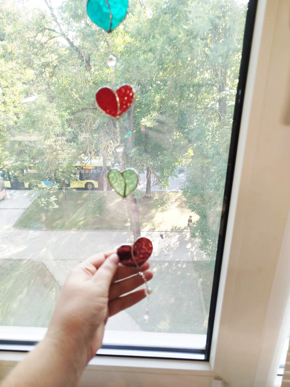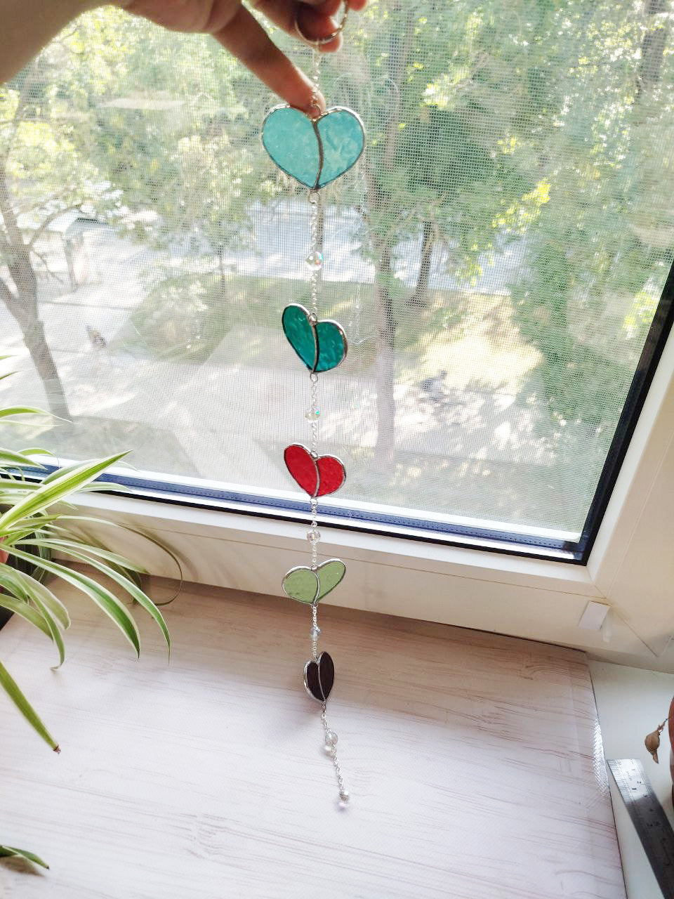 Stained glass heart, Dream Sun Catcher colored hearts with crystal beads, Hanging Window Suncatcher, Romantic Home Deco, Unique Gift for Her